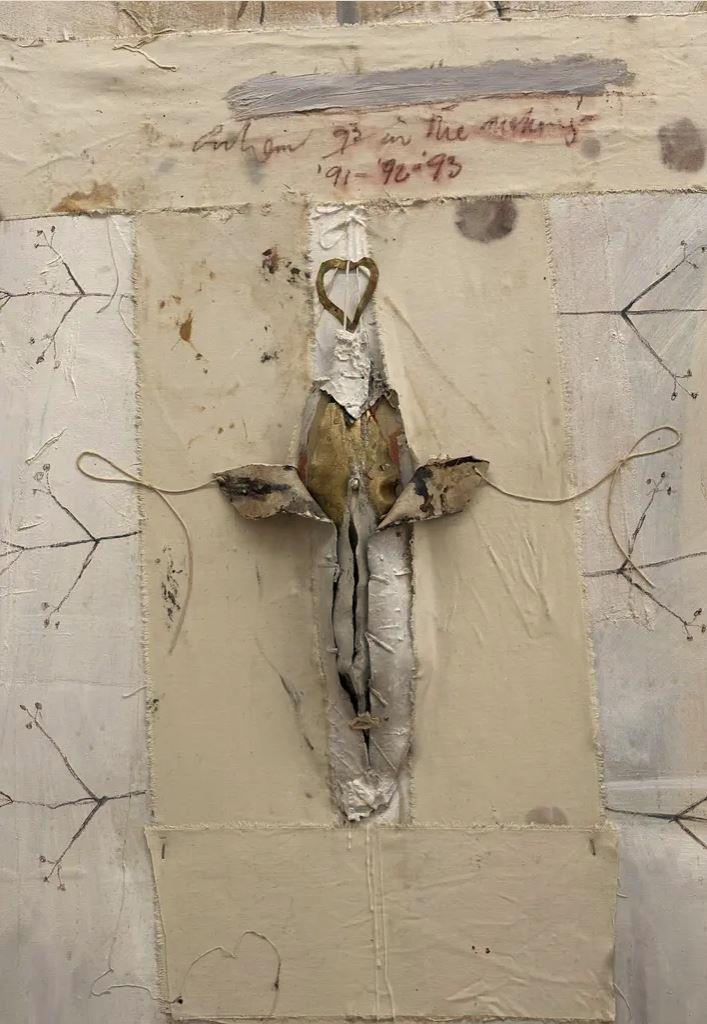 Graham’s canvas and paper surfaces are translucent, shredded, ripped, puckered, folded, punched, battered, tattered, swollen, sunken, pierced, punctured, bruised. Areas are erased, masked, bandaged, buried, painted over, scabbed with layers of paste, tape, cloth, photos snipped from magazines, and, in one notable case, a handful of medicinal glitter, plumbing the foul rag and bone shop of the heart. Graham integrates tattoos of feverish text that rise and drift like chants through the fog of perception and memory, the way one may mutter to oneself between wakefulness and dreaming, akin to Molly Bloom’s closing soliloquy in James Joyce’s Ulysses.